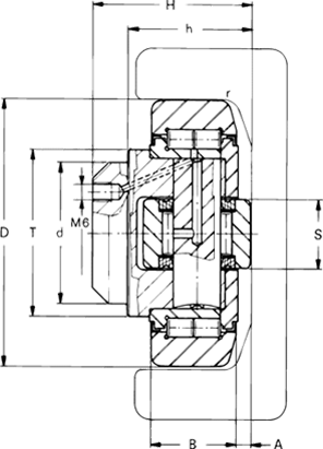 | Typ | D mm. | T mm. | d -0.05 mm. | H mm. | h mm. | B mm. | A mm. | S mm. | r mm. | Typ | FR KN | FA KN | C KN | CO KN | CA KN | COA KN | u/min max. | Ciężar kg | Płyta montażowa | Profile Standard |
